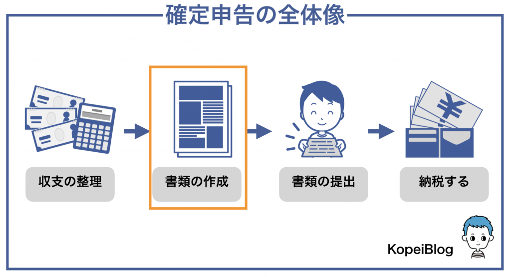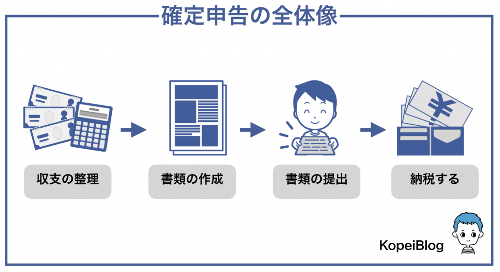 確定申告のおまかな流れは4つの要素に分解でき、上記の流れが必要です。