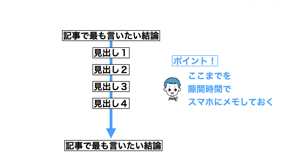 ここまで説明してきた記事の骨格の作り方、つまり「結論」と「見出し」を隙間時間で作成するわけです。