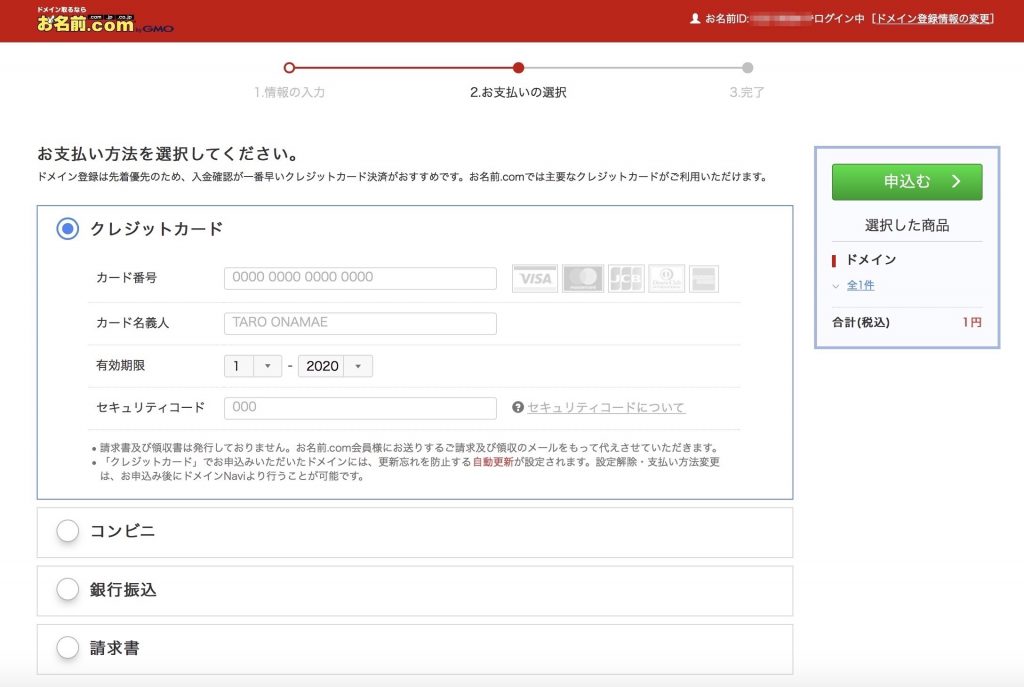 チェック枠が空白のものは使用可能であり、希望のドメインを選択し「お申し込みへ進む」をクリックします。
